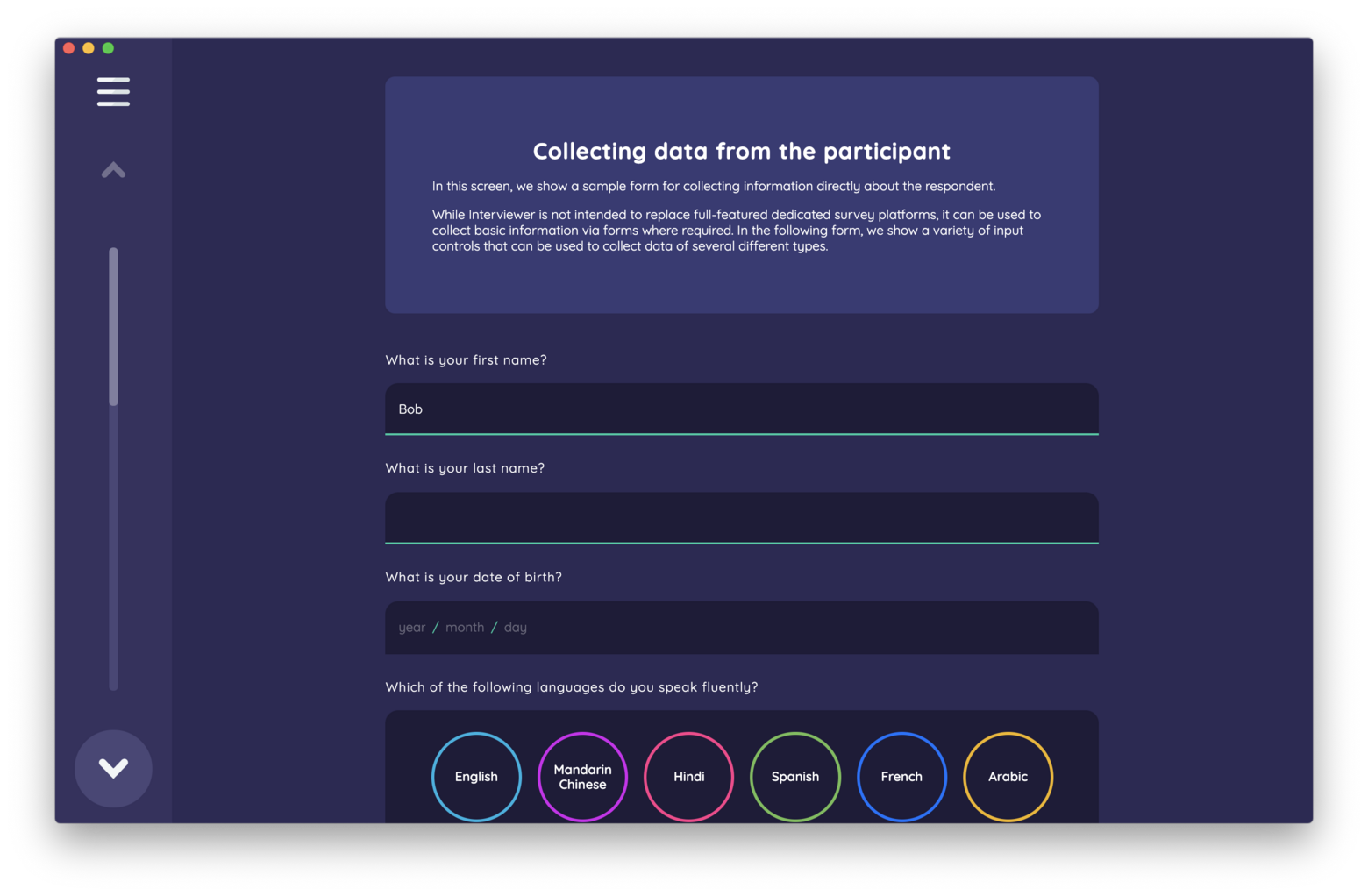 The Ego Form is an interface that collects data on your participant (ego). When using the Ego Form, participants complete a form about themselves that consists of one or more fields. This Interface also contains an embedded introductory panel where the purpose of the form can be described to a participant.