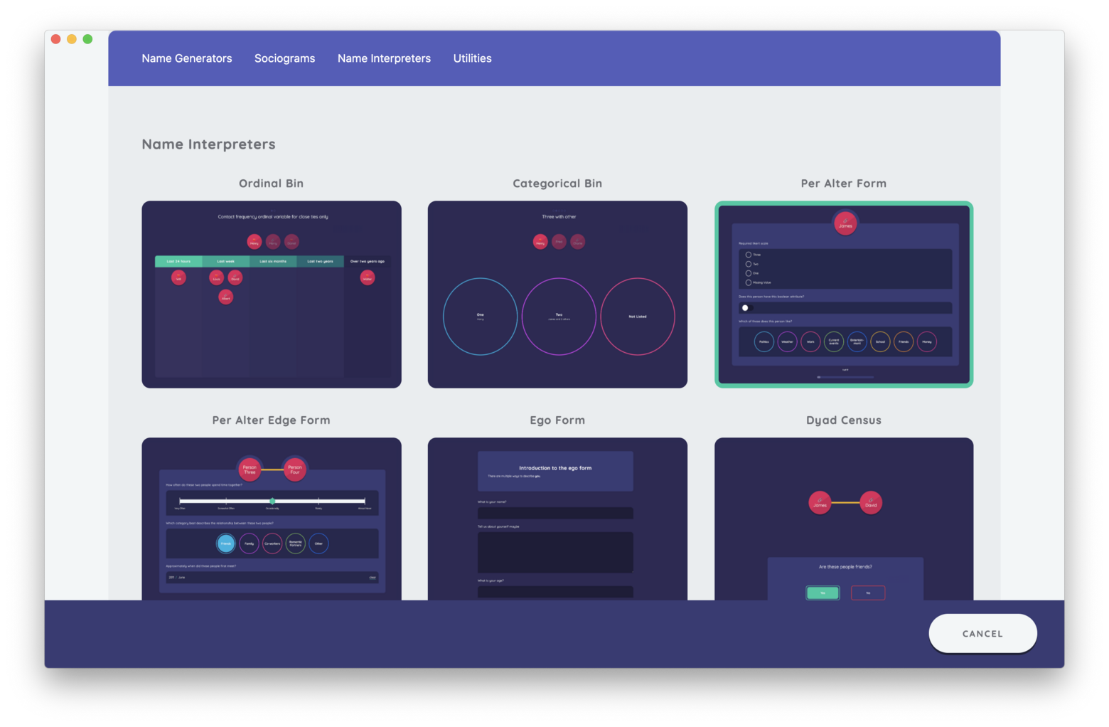 The Per Alter Form is a name interpreter interface that captures attribute data on the alters in a participant's network. When using the Per Alter Form, participants review an introductory panel which describes the tasks on the stage and then complete a form on each node in their network. These forms are customizable and can include one or multiple fields to collect specific attribute data using a variety of input controls.