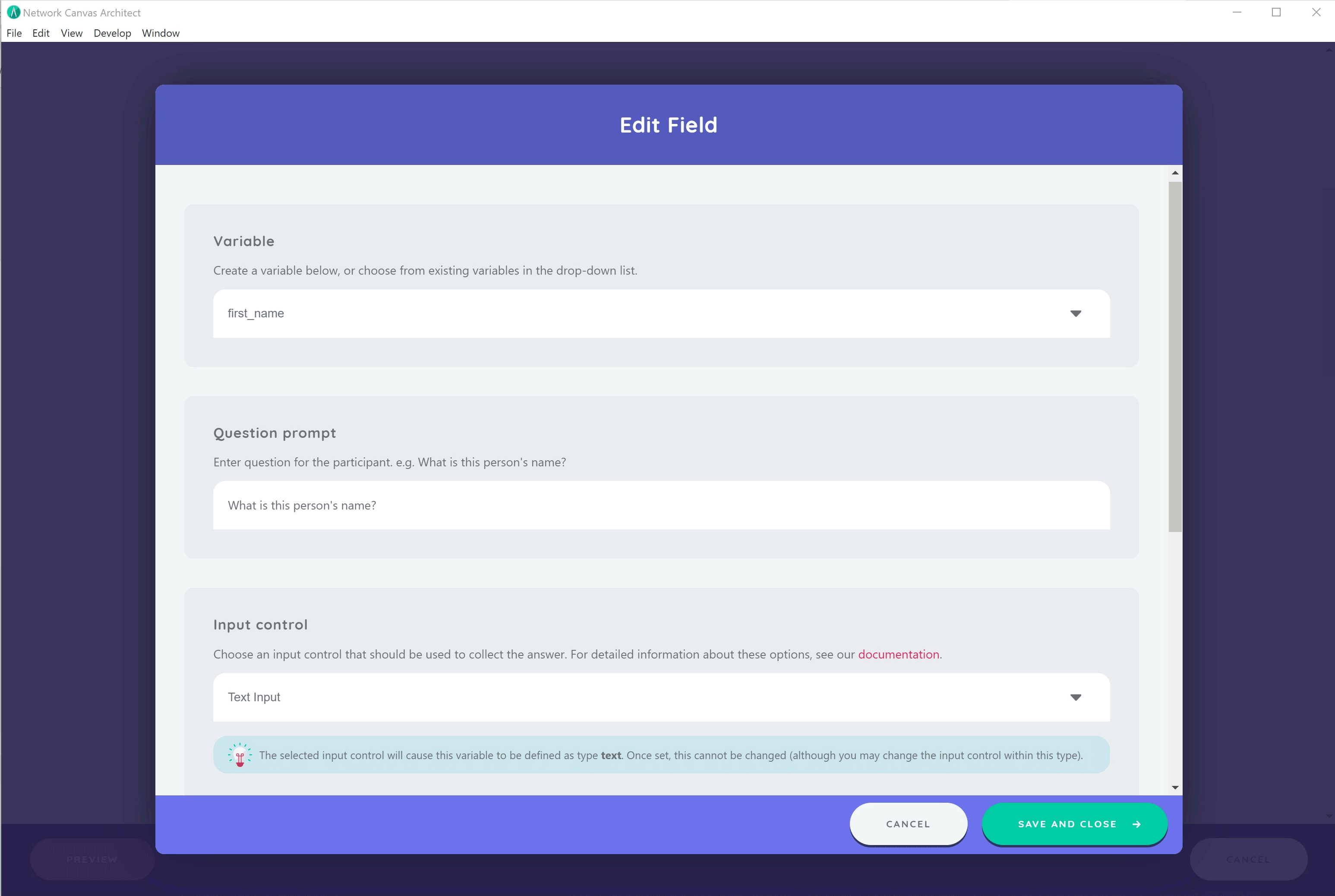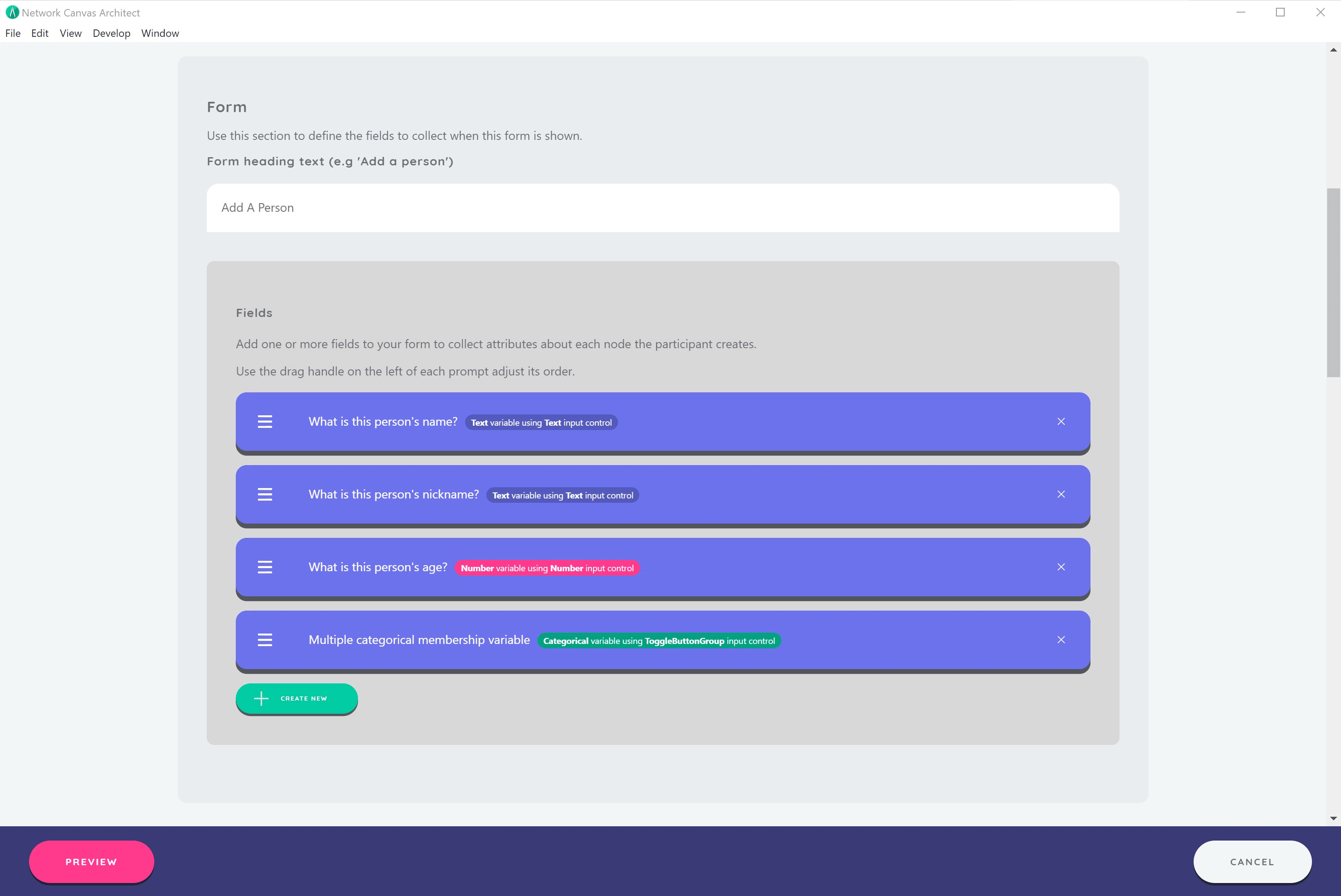 - Although it may be tempting to create long and elaborate forms, as is typical within other more traditional survey software, consider the burden of overloaded forms on participants and data quality. For example, while you can capture categorical data within a form, you might elect to use the Categorical Bin Interface instead. Network Canvas Interviewer is not intended to replace existing survey methods.