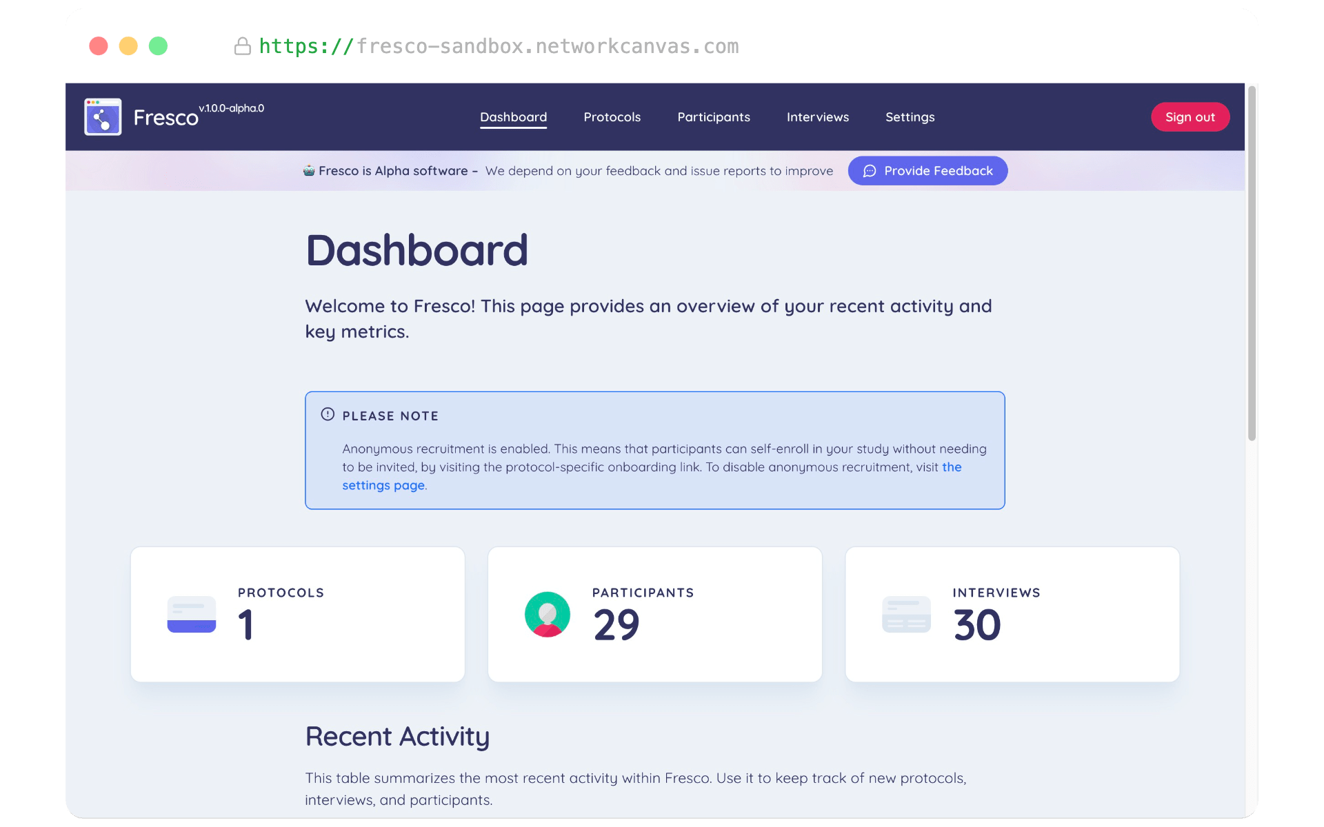 Fresco includes features to support participant management, protocol management, and data export. It is also designed to be 100% compatible with all existing Network Canvas protocols. Below you can find a brief overview of the features and functionality of Fresco.