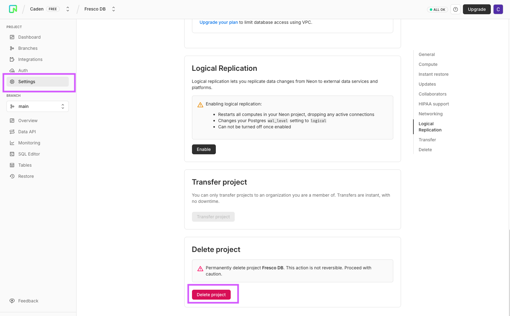 Select the Settings tab, scroll to the bottom, and click Delete project.