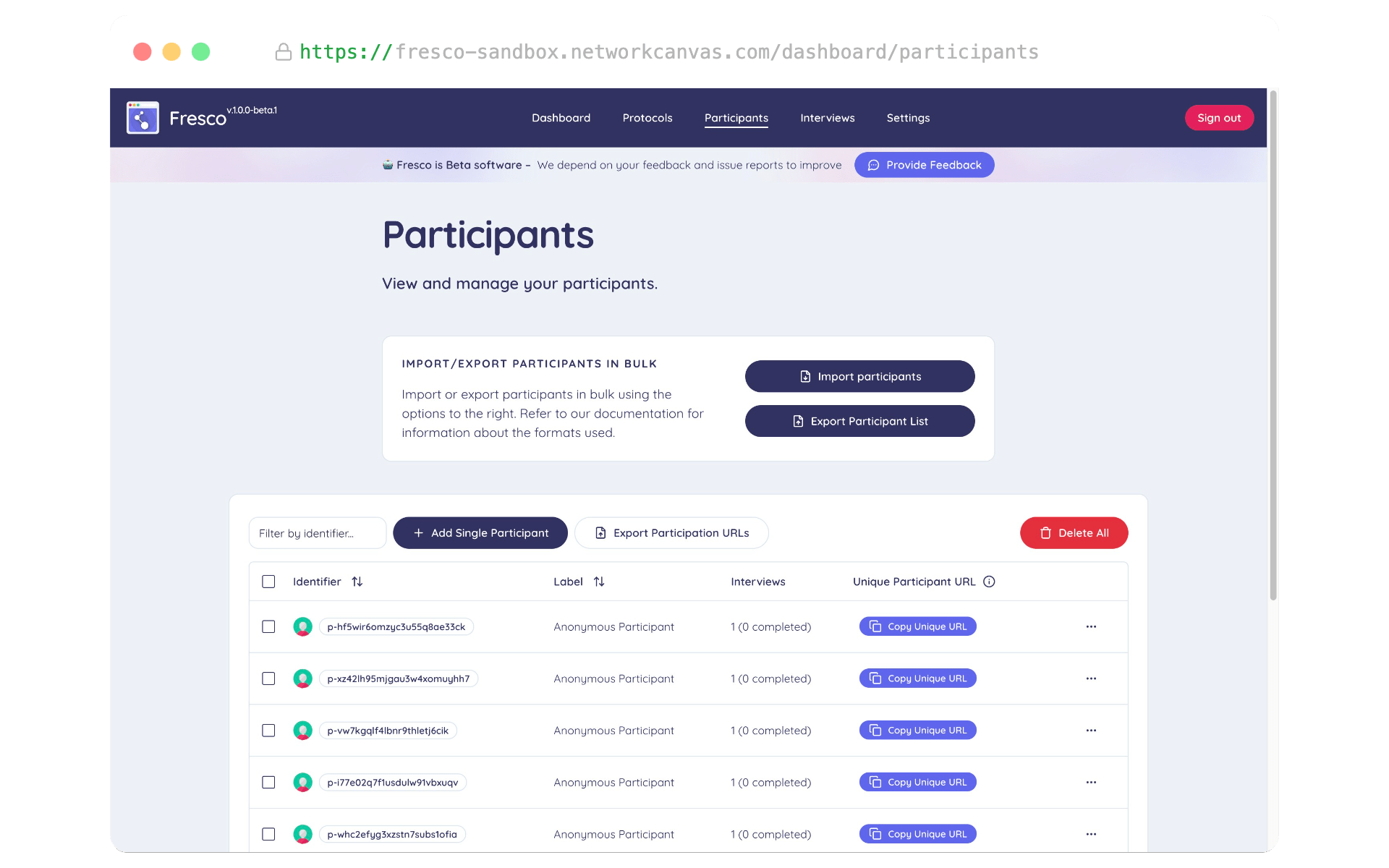 Regardless of the approach, Fresco defines all participants by their participant identifier and an optional label. For known participants, you can provide the participant identifier (which is useful for linking responses to external data sources), or Fresco can generate one at random. If you enable anonymous recruitment, Fresco assigns participants a random identifier when they begin an interview.